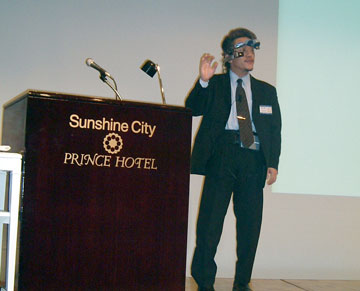果たして、HMD、ひいてはウェアラブルPCはビジネスになっていくのだろうか。 ビジネスとして考えると、塚本助教授の姿は、あまりにも異様に見える。2001年4月からウェアラブルコンピューティングの実戦を始めたという塚本助教授は、「2年近くものあいだ、ほかにウェアラブルを実践する人が出てこなかったのは意外だった。研究者のなかには追従してくる人が出てきてもおかしくないと思ったのだが」と打ち明け、会場から笑いをとる。
