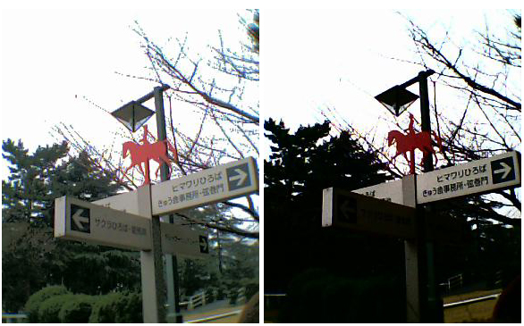 D251iSは非常にデジタルカメラ的な撮影機能を多く持っている。 その象徴が画質をコントロールする機能。撮影時に上下のキーで、コントラスト、明るさ、コンパクトライトの明るさなど項目を選んで強さを変更可能だ。例えばコントラストを最強と最弱ではこれだけの違いがある。