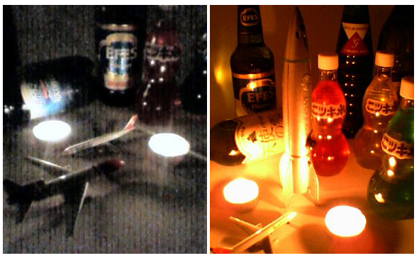 ろうそくの灯りでも普通に撮れているD251iSに比べると、P251iSは明らかに暗所に弱いという欠点をさらけだしてしまった。色が急に失われ、縦方向のノイズも出てしまっている。 そこでフォトライトを点灯して撮影してみた。 多少は明るくなり色も出ているが、縦縞のノイズは消えていない。フォトライトを消灯し、ナイトショットモードをオンにしてみると、こうなる。