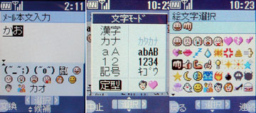 A1301Sのみならず、ソニー・エリクソン製端末の最大の特徴は、ジョグダイヤル+POBoxにある。必須機能になってきた予測変換の元祖であり、文字入力の快適さは現在でも間違いなくトップクラスだ(2002年12月の記事参照)。 文字入力時は、左ソフトキーで「モバイルWnn」を使った単漢字変換、右ソフトキーで文字種の変更ができる。POBoxでは、「あ」を入力すると「1」が予測候補に登場し、「えー」と入れると「a」が、「はーと」と入れると絵文字のハートが出るなど、極力文字種変更を行わなくてもいいようになっている。 絵文字を複数続けて入力するための配慮もされている。文字種を絵文字に切り替えると、絵文字一覧が表示され、右上の[連続]ボタンで複数の絵文字を一括入力できる。ページ送りキーも利用可能だ。絵文字、定型文の入力後は、自動的に元の文字モードに戻るようになっており、絵文字入力後に再度文字モードを変える必要もない。 なお、「SO212i」にはあった大文字/小文字変換ボタンは用意されていない。