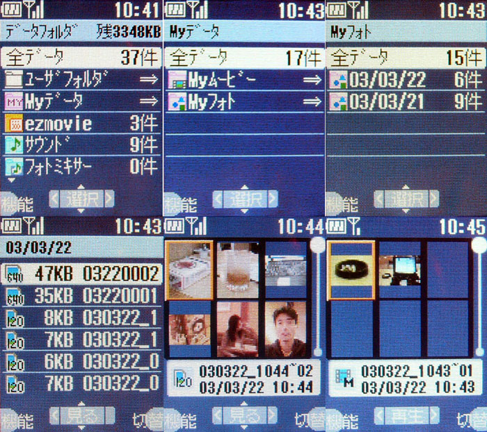 A1301Sの回転カメラは、とにかくレスポンスの良い動作が特徴だ。待ち受け画面から側面のカメラボタンを押すだけで起動。シャッターレスポンス、保存速度にも不満はない。静止画、動画ともシャッター音はプリセットの7種類から選択できる。なお、閉じたまま撮影することはできない。 VGAサイズの写真でもデジタル3倍ズームが可能で、こちらも操作は快適だ。ただしVGA画像は一切加工できないのが残念。スタンプやフレームはもちろん、回転やサイズ変更も行えない。壁紙などへの登録も不可だ。つまり50Kバイトを超えるVGAサイズ画像は、Eメールに添付して送ることにしか使えない。せめて、閲覧時に拡大・縮小だけでもできれば、サイズを活かせる。もったいない。 データフォルダはauの標準タイプだ。異なるのは静止画・動画共にサムネイル表示が行える点。画面下部には画像種別やファイル名、撮影日時も表示され、右ソフトキーでファイル一覧と簡単に切り替えられる。唯一不満なのは、サムネイルの表示速度が遅い点。ファイル名一覧がデフォルトになっているのはこうしたことを考慮したためか。もっとも、現在のカメラ付き端末でストレスを全く感じないサムネイル表示を行えるのは、ドコモ向けの「SH251iS」のみ(2002年12月の記事参照)。A1301Sは平均以上といえるだろう。 撮影した画像・動画は「アルバム」や「サブフォルダ」への移動も可能。ただし1枚1枚移動する必要があり、移動作業はかなり困難だ。