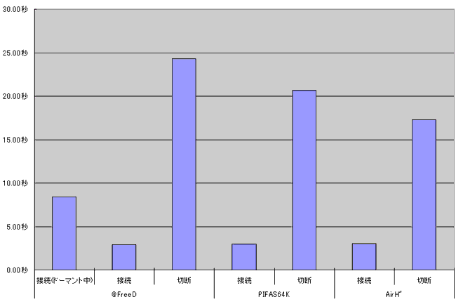 ![]() 第1回目のレビューでドーマント状態からの再接続は「おおむね5秒程度」としたが(3月12日の記事参照)、今回の結果では接続中とドーマント中の差が5.48秒となった。ドーマント状態からインターネット接続が可能になるまでのタイムラグはおおむね5秒と考えて差し支えないだろう。 ドーマント状態からインターネットを利用するときは確実にタイムラグが発生するが、IE6.0の自動接続機能を利用してインターネット接続を開始させた場合よりはずっと早い。インターネットから切断した状態からの場合、最も速かったのはAirH"だが、それでもドーマント状態からの再接続に比較すると倍以上の時間を要している。