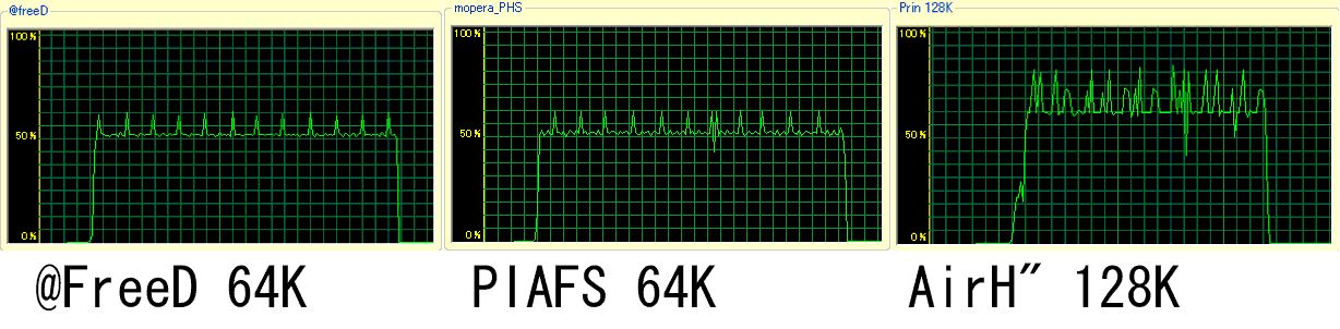 ![]() 左から@FreeD、PIAFSでの64K接続、AirH" 128K接続。ここではAirH" 128Kが最高速度の高さを生かした。これに対して@FreeDは受信速度が極めて安定していることが分かる