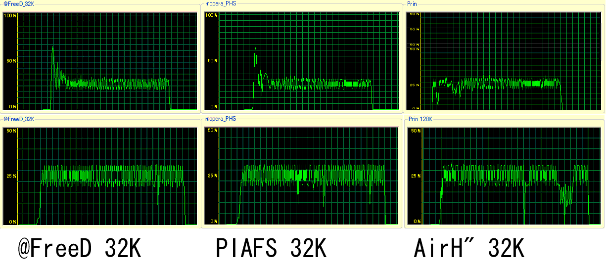 ![]() 左から@FreeD、PIAFSでの64K接続、AirH" 128K接続。ピーク速度はAirH" 128Kが速いが、Webページ全体を受信し終わる時間は@FreeDやPIAFSの64K接続の方が早い。一定帯域が確実に確保されているメリットが生きた形だ まずは@FreeDとPIAFSの64K、AirH" 128Kでの比較。Webページを完全に読み出し終わるまでに一番時間を要したのはAirH" 128Kだ。途中までは明らかに高速なのだが、後半は一気に受信速度が低下している。 @FreeDやPIAFSの64Kほうがまんべんなくデータを受信しており、トラフィックに関係なく帯域が確保される回線交換ベースのメリットが出ている。なおここでも複数回計測しているが、AirH" 128Kは同様の傾向を示した。 同じ組み合わせで約1Mバイトのファイルをftpで受信させてみたところ、また異なる傾向を示した。最も高速だったのはAirH" 128Kであり、最高通信速度の高さが強く反映されている。ただ注目してほしいのは@FreeDの安定した受信速度だ。おおむね理論限界値で安定したデータ受信が行われている。