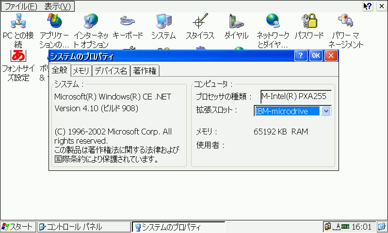 CPUは「PXA255/400MHz」、OSは「Windows CE.NET Ver.4.10」を搭載。Type IIのCFカードスロットでは日立の小型ハードディスクドライブ「MicroDrive」も問題なく使用できた