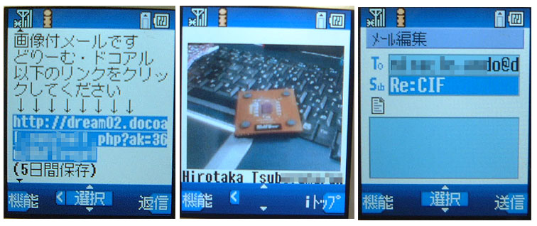 FOMAからどりーむ・ドコアルで送信されたメール(左)。記載されたURLから画像にアクセスできる。送信されたURL付きメールにはそのまま返信もできる(右)。画像は5日間サーバに保存される
