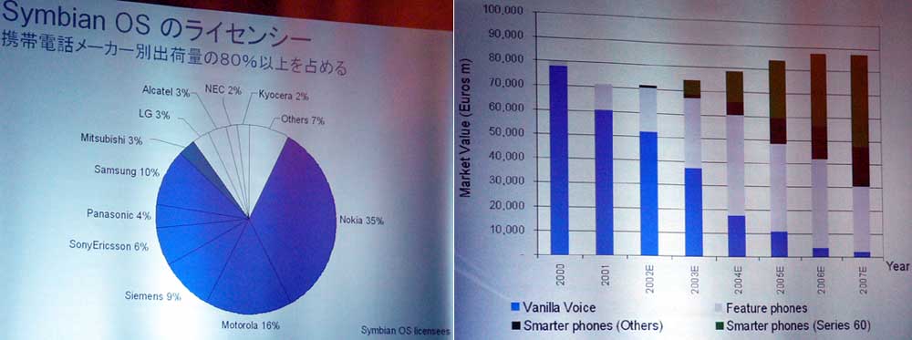 ![]() 広くライセンスされる標準的なOSとしては、Symbian OSのシェアは大きい。携帯電話メーカー各社のジョイントベンチャーとして生まれたSymbianの株主には、Nokia、Motorolaをはじめ、Sony Ericsson、Siemens、Panasonic、Samsungなど大手海外メーカーが名を連ねる。Symbian OSのライセンス先にも大メーカーが並び、各社のシェアを合計すると、世界シェアで8割にも達する Symbian OSの特徴の1つは、「一種のPCのような世界」(小西氏)をもたらすオープンプラットフォームであることだ。将来に渡ってサポートする標準APIを定め、ソフトウェアの互換性を保持する。「Symbian OSは、きっちりAPIを守ればどの端末でも動く」(小西氏)。 現在の携帯電話のOSのほとんどはカスタムメイド──そのメーカー独自のものだ。ところが端末の高機能化が進むにつれ、開発期間とコスト、そしてリスクの多くはソフトウェアが負うようになってきている。標準的なOSを使うことで、バグも減らせるし、世界中のアプリケーションを利用できるようになる。携帯電話メーカーがSymbian OSに注目する理由の1つはそこにある。 ※ネイティブアプリケーションをダウンロードして実行できるのがSymbian OSの最大の特徴と言えるが、「ドコモさんは、まだオープンプラットフォームという考え方をお持ちになっていない。ダウンロードして楽しむという考え方は日本にはない。(Symbian OS搭載の)F2051もダウンロードできるのはJavaだけだ」(小西氏)。 実際、Symbian OS採用端末の数は急拡大している。2000年にEricssonが「R380」がSymbian製OSを搭載したのを皮切りに、「Nokia 9210」「Nokia 7650」Sony Ericssonの「P800」などが登場。日本でも、富士通製の「F2051」、もうじき登場する「F2102V」(6月16日の記事参照)がSymbian OSを搭載する。 ※初出で「R380]がSymbian OS v6.0搭載としましたが、最初のv6.0搭載端末は「Nokia 9210」になります。お詫びして訂正させていただきます。 出荷台数もうなぎ登りだ。Nokiaのミドルレンジ「Nokia 3650」は、「月産で軽く100万台。これがうなぎ登りの貢献機種」(小西氏)。現在、出荷済みの製品は4社15製品。その後も開発中のものが10社21製品、仕様策定中のものは9社17製品があると小西氏は言う。