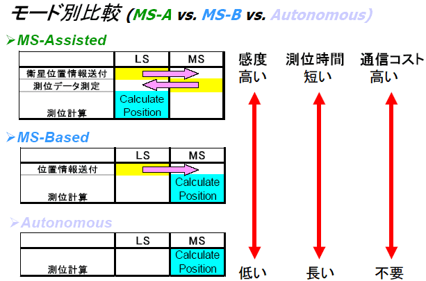 KDDIのGPSケータイに採用されている米クアルコムの技術、「gpsOne」はMS-Assisted型に当たる。GPS衛星の情報をサーバに用意しておくことで衛星の捕捉を容易にし、さらに測位の最終計算をサーバで行うことで、携帯電話側の負担を軽減すると共に、測位精度を上げられるメリットがある。 ただし、MS-Assisted型では測位ごとにサーバへの通信が必要となり、通信コストが発生するほか測位に時間がかかるという問題があった。クアルコムジャパンによると、1回の測位に必要な通信コストは5−8円。そのため、クアルコムでもMS-Based型を開発しており、KDDIも秋から冬にかけての端末で実装する予定になっている(2002年8月の記事参照)。 NECエレクトロニクスが開発したLSIセットは、さらに一般に自立型と呼ばれる、サーバを必要としない測位方式をサポートしているのが最大の特徴。感度や測位時間は悪化するが、通信コストがかからずサーバとやりとりできないエリアでも測位が行えるメリットがある。