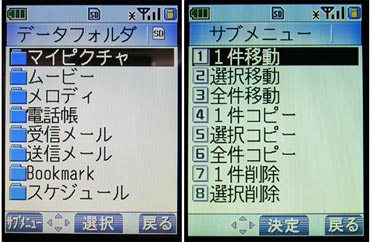 505iシリーズ共通機能となる外部メモリにはminiSDが採用された。miniSDカードには、静止画や動画の保存に加え、電話帳、スケジュール、メール、ブックマークなどもバックアップできる。 静止画、動画はminiSDカードに直接記録できるほか、本体メモリと相互に移動やコピーが行える。全件や複数選択もサポートし、コピーや移動の書き込み時間も速い部類であるなど管理機能は充実している。よくできているだけに、複数選択時にサムネイル表示が利用できないのは返す返すも残念だ。