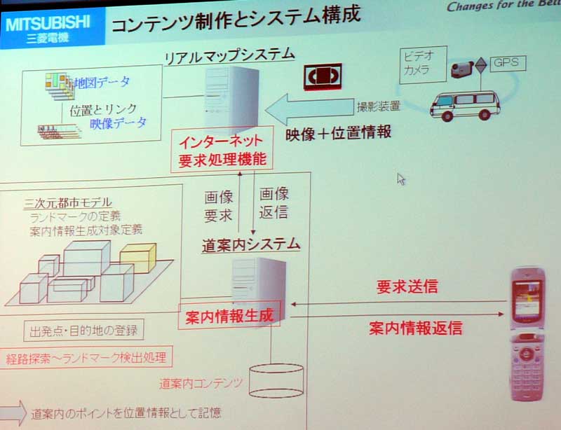 ![]() あらかじめ定められたルートの、交差点などのポイントを、事前に撮影した動画から抽出して携帯向けページを生成する。ユーザーは定められたルート上であれば、任意の場所の画像のオンデマンド配信を受けることもできる 従来こういった案内サービスを行うには、各交差点で写真を撮り、手作業で各ページを制作する必要があった。このシステムの特徴は、ページ作成を自動化できる点にある。 コンテンツ制作者は、まず出発地点から目的地までの道程を、GPSを備えたカメラで動画撮影する。この動画データを、既に商品化されている「リアルマップシステム」のサーバに登録する。 今回開発した道案内システムは、ビルなどの立体データ「三次元都市モデル」を備えており、ルート中の交差点やランドマークが見える地点などを自動的に検出する。検出された数地点の画像を動画から自動抽出し、携帯向けのページを生成する。 携帯電話からは生成された画像を閲覧できるほか、ルート中の画像であれば、任意に画像をサーバに要求できる。サーバ側は要求された地点の画像を動画から抽出して送信することができる。 三菱電機では、今後GPS機能との連携や、静止画だけでなく動画の配信などを想定している。
