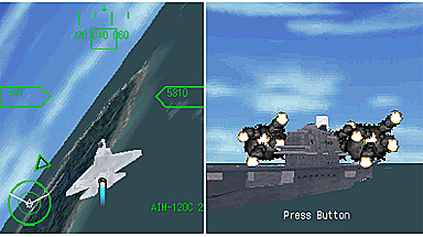 ![]() 「ENERGY AIRFORCE 外伝2:海戦」の自機画像(左)と敵艦を撃沈した時の画像。自機を後方から見る視点をデフォルトで採用した。PS2版ではコクピット内からの視点がデフォルトだが「ライトユーザーも多い携帯向けに、自分の状況がわかりやすい、後方から見る視点を採用した」(同社) 「ENERGY AIRFORCE 外伝2:海戦」は、PlayStation 2ゲーム「ENERGY AIRFORCE」をJ-スカイ用に移植した「外伝」シリーズ第2弾。陸上だった前作から舞台を海上に移し、リアルなバトルを楽しめる。 PS2版では、離陸できずにゲームオーバーになることもあるほど離陸が難しかったが、携帯版では起動するとすぐ飛行モードに入る。「じっくり腰を据えてプレイするPS2とは違い、携帯ゲームはちょっとした空き時間にやるもの。気楽に遊べるようにした」(同社)。とはいえ“できるだけリアルに”というPS2版のコンセプトは引き継ぎ、積めるミサイルは2発までなど、実際の戦闘機に近い設定を採用している。 配信開始は10月15日で、料金は1ダウンロード500円。