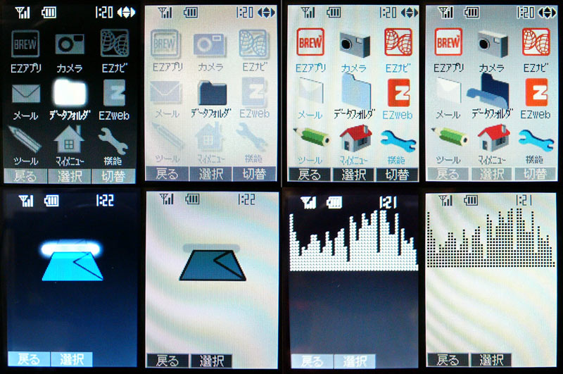 ![]() やっぱりデザインはカラーに合わせたい。左上の黒ベースはICHIMATSU用、白ベースはBUILDING用か。下のメール受信用アニメと着信用アニメも白ベースと黒ベースが選べる。NISHIKIGOIには白を使うと合いそうだ