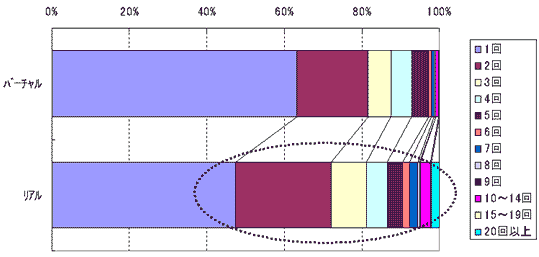 ![]() 利用頻度。「リアルのほうが繰り返し利用する率が高く、継続利用につながっている」(KDDI) 購入された商品のジャンルは、バーチャルがCD・ビデオ・DVD、書籍・雑誌、食料品・酒・飲料で8割を占めた。リアル店舗では、衣料品やレストラン、飲食を中心に幅広いジャンルでの利用があった。