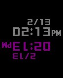 | 省電力モードに入ったときに表示される時計の画面(要設定)。preminiの基調カラーは白・黒・紫。白をメインに上下反転させた紫の時刻も表示される。上からのぞき込んだ場合でも時間が分かる工夫だ |