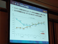 現在、コンテンツのARPUは500円弱となっているが、ターゲット層の拡大や定額制の導入により着実に上昇している。やはりパケット通信料の定額サービスの影響はかなり大きいという。また、データARPUも順調に推移している。2004年第1四半期以降、ドコモのデータARPUが下がったことと、auの定額制導入効果でARPUが上昇したことから、2005年8月にドコモに追いついた。その後着実に上昇を続け、現在は2000円となっている。