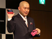 実は喜久川氏は「WILLCOM D4」を披露したときにも、そのコンパクトなボディをアピールすべく、白いCOACHのバッグからD4を取り出して見せている。どうやら、この“バッグパフォーマンス”は好評だったようで、今回も「このシリーズを続けろと部下の指示が出て」(喜久川氏)、白いCOACHのバッグからピンクのハンドバッグを取り出し、その中からWILLCOM 03を取り出して見せた。「あいかわらず、すごく恥ずかしいんですけど……」(同)