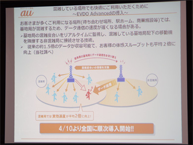 4月10日からはEV-DO Advancedを導入し、より通信品質が向上することも西山氏はアピールする。同技術は、混雑中の基地局配下の携帯電話を、混雑していない周辺基地局に接続させるもの。従来より、1.5倍のデータトラフィックが収容可能になり、「実効通信速度が平均2倍に向上する」という。