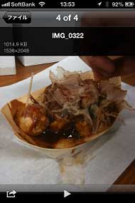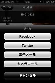SNSなどに写真をアップロードする際もいちいちiPhone側にコピーする必要はない。目的のファイルをタップするか、編集アイコンでファイルを選択し、画面右上のオプションアイコンを選択。すると「Email」や「Camera Roll」など送信先のメニューが現れるので、ここで「Twitter」や「Facebook」を選べばいいもちろん、SDカードやUSBメモリーを頻繁に外部ストレージとして利用したい人にとってもWi-Fiの接続先を切り替える手間がないのは便利だ。iPhoneなどと一緒に持ち歩き、常用することを考えた製品といえる。