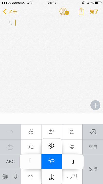 意外と知られていないかもしれませんが、ひらがなのキーボードの「や」を長押しすると、フリックの左右に「」が表示されます。これまで「カッコ」と入力していた人も「や」の長押しで「」が素早く入力できます。