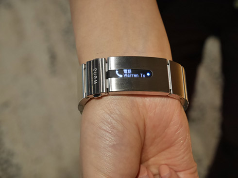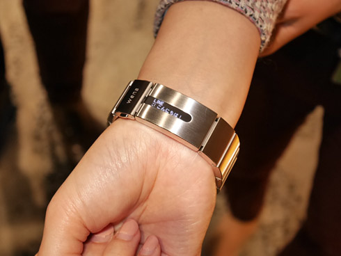 大きく変わったのは通知機能。初代機は7色に光るLEDで着信などを知らせるだけだったが、今回は内側に横長の有機ELディスプレイを搭載し、1行もしくは2行表示(文字サイズ変更可能)でメッセージ内容や発信者の名前を確認できるため、わざわざスマートフォンを取り出さなくても済むシーンが増えた。ただし、FeliCaを搭載しながらSuicaには非対応という点も変わらない。同社は「技術ではなく、ビジネス上の問題」と説明している。