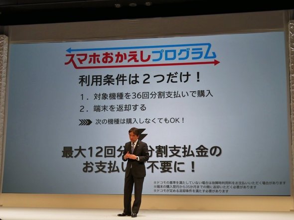NTTドコモは、auとソフトバンクの端末購入プログラムは「法改正の趣旨に反する」とのスタンス。ドコモが提供する「スマホおかえしプログラム」では、プログラム利用料を徴収していない。残債免除の条件に「新機種の購入」も設けておらず、「端末返却のみ」としている。SIMロックの100日ルールや新機種購入の条件によって他キャリアを選ぶことが困難になるため、拘束力が強い、と同社は考える。