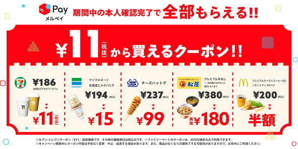 「お支払い用銀行口座の登録」または「アプリでかんたん本人確認」のいずれかで本人確認が完了したユーザーへ、11円(税別)から利用できるメルペイクーポンを複数枚配布。完了した時期によりクーポンの種類が異なる場合があり、対象期間は4月30日まで。