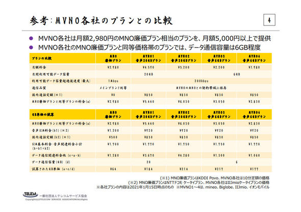 総務省の有識者会議「接続料の算定等に関する研究会」の第40回会合では、テレコムサービス協会MVNO委員会が、ahamoなどの料金プランのGBあたりの単価がMVNOの主要プランの2分の1から3分の1の水準であるとし、競争が困難な現状を訴えているもちろん、いくつかのMVNOは既に大手への対抗プランを打ち出している。最も早く動いたのが日本通信で、2020年12月10日に月額1980円で通信量16GB、かつ70分の無料通話が付く「合理的20GBプラン(今は16GB)」の提供を開始。2月18日からは通信量を20GBに増量して「合理的20GBプラン」を正式に提供する。