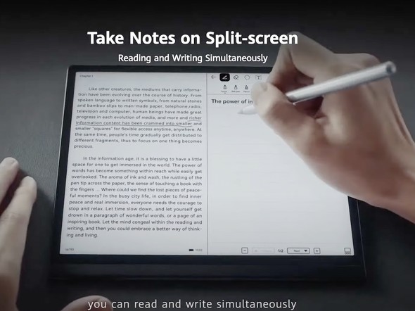 書籍や書類を読むだけでなく、「Notesアプリ」を使って手書きもできる。既にHuaweiのタブレットで採用されている「M-Pen」が付属し、本体側面に取り付けることが可能だ。レイテンシ(遅延)は26ミリ秒で、4096段階の筆圧感知にも対応する。音声を記録しながらメモを取ったり、手書き文字をテキストデータに変換したりできる機能も搭載する。