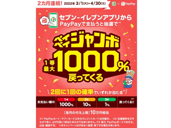 「セブン-イレブンアプリで当たる!ペイペイジャンボ」では、全国のセブン‐イレブンの店舗で購入した商品の代金をセブン‐イレブンアプリからPayPayで支払うと、抽選で決済金額の最大1000%(10倍)をPayPayボーナスとして付与する。期間は3月1日〜4月30日。