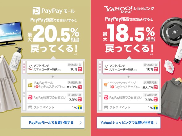 PayPayモール特典やPayPay残高での支払い特典、Yahoo!プレミアム会員特典などを組み合わせると、PayPayモールでは最大20.5%相当、Yahoo!ショッピングでは最大18.5%相当が付与される(関連リンク)。