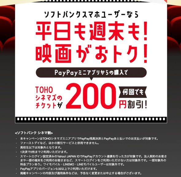 ソフトバンクユーザーがPayPay内のミニアプリでTOHOシネマズの映画のチケットを購入すると、平日も週末も200円引きになる。利用上限は1回の購入で2枚までとなり、期間は2022年4月21日10時から2023年3月31日23時59分まで。ファーストデイなど他の割引サービスと併用はできず、高校生以下は対象外(関連リンク)。