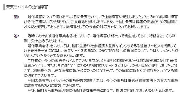 楽天モバイルには「利用者への迅速な周知広報が必要だったに関わらず、周知広報もが大変遅れたのは誠に遺憾」と苦言を呈し、電気通信事業法上の重大な事故に該当するとの認識を示している。今後は事故原因などに係る詳細な報告を踏まえて、適切に対応するという。