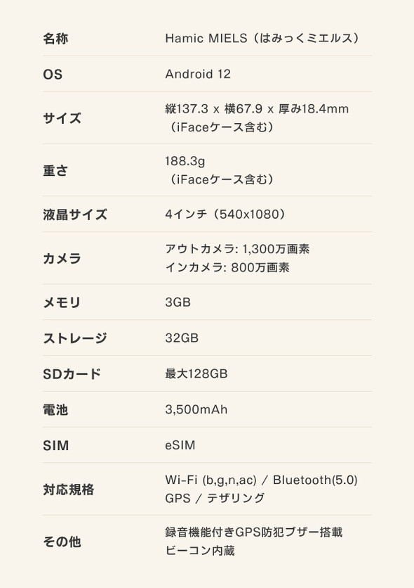 本製品は2021年2月に発売した小学生向けキッズスマホ「Hamic POCKET」よりサイズを拡大し、見守り機能を強化した端末。ottaと共同開発した「MIELSシステム」を搭載し、保護者は子どもの位置情報や行動履歴などの確認の他、設定した「見守りスポット」への到着通知を受け取れる。