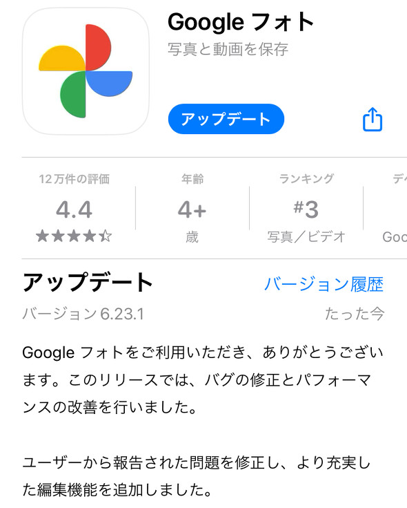 【UPDATE】日本時間の14日午後7時過ぎにApp Storeを確認したところ、Googleフォトのバージョン6.23.1が公開されていた。