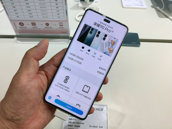 せっかくなのでHONOR 90と比較してみました。HONOR 90はディスプレイサイズが6.7型と若干小さく、プロセッサはSnapdragon 7 Gen 1 Accelarated Edition、インカメラは5000万画素のシングルです。価格はメモリ12GB+ストレージ256GBモデルでHONOR 90 Proが3499元(約6万5000円)、HONOR 90が2499元(約4万9000円)です。プロセッサの差が価格差に如実に反映されています。