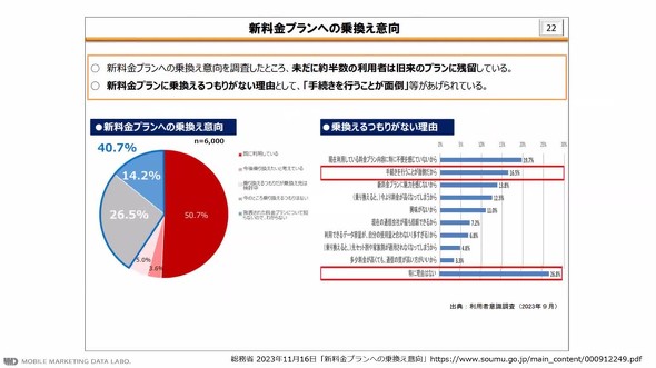 一方で、総務料が新料金プランへの乗り換え意向を調査したところ、MNOのサービスを契約する人の約半数が旧来の料金プランにとどまり、新料金への乗り換えができていないことが判明。理由の多くに挙がるのが「乗り換えに関する手続きの面倒さ」だ。吉本所長はこれらの資料をもとに「実態として乗り換えが十分に促進されていない」ことを指摘する。