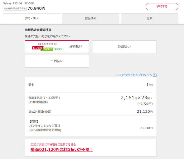NTTドコモは、5月30日にサムスン電子のミドルレンジスマートフォン「Galaxy A55 5G SC-53E」を発売。一括価格は7万840円(税込み、以下同)で、23カ月目に端末を返却する「いつでもカエドキプログラム」を適用した際の実質負担額は4万9720円となる。