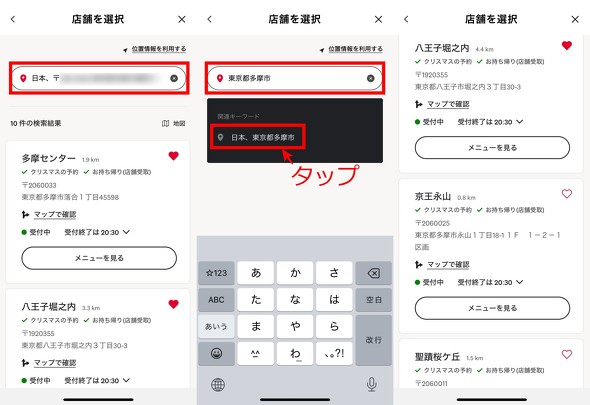 続けて食べたいものを選んでオーダーしていこう。店舗によって在庫商品や取り扱い商品が異なるからか、すぐにメニューを見ることはできない。段階的に選んでいき、ようやくメニューにたどり着ける。まずはアプリ上部、または中央より下にある「注文する」ボタンをタップし、それから「持ち帰り」を選択、店舗を選ぶ。