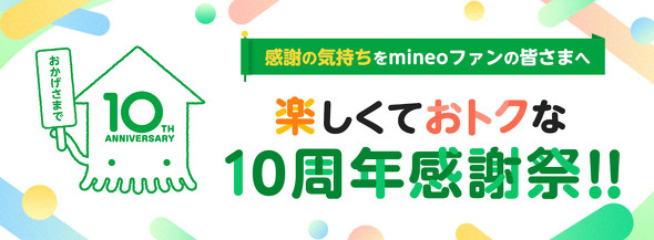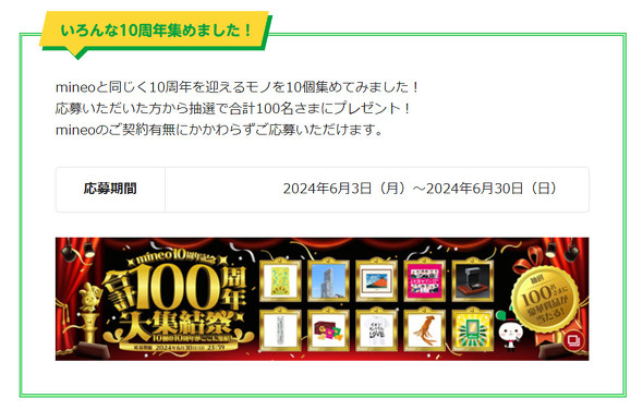 また、mineoと同様に「10周年を迎えるモノやサービス」を応募者の中から抽選で100人にプレゼント。mineoの契約有無にかかわらず応募可能で、特設サイトからの応募受け付けは6月30日まで。8月以降もオリジナルグッズの抽選プレゼントや、開催イベントの申し込み受け付けなどを順次行う。