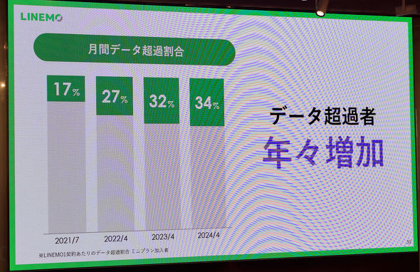 LINEMOベストプランを10GBまでの段階制とした理由について、ソフトバンク 専務執行役員 コンシューマ事業推進統括の寺尾洋幸氏は、ミニプラン加入者の3GBを超過する割合が年々増加していることを挙げる。月間データ超過の割合は、2021年7月時点では17%だったところ、2024年4月は34%に上がっている。