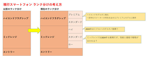 ミドルレンジが細分化したのが直近の傾向だが、2024年の注目はミッドハイ。ハイエンドに迫る性能を実現しながらコストも抑えているので、スペックも価格も重視する欲張りな人にオススメしやすい。ミドルのスタンダードも、防水やおサイフケータイに対応したモデルも多く、必要十分なスペックを有しているので狙い目だ。総じて、2024年のミッドレンジはコストと性能のバランスに優れており、お買い得だといえる。
