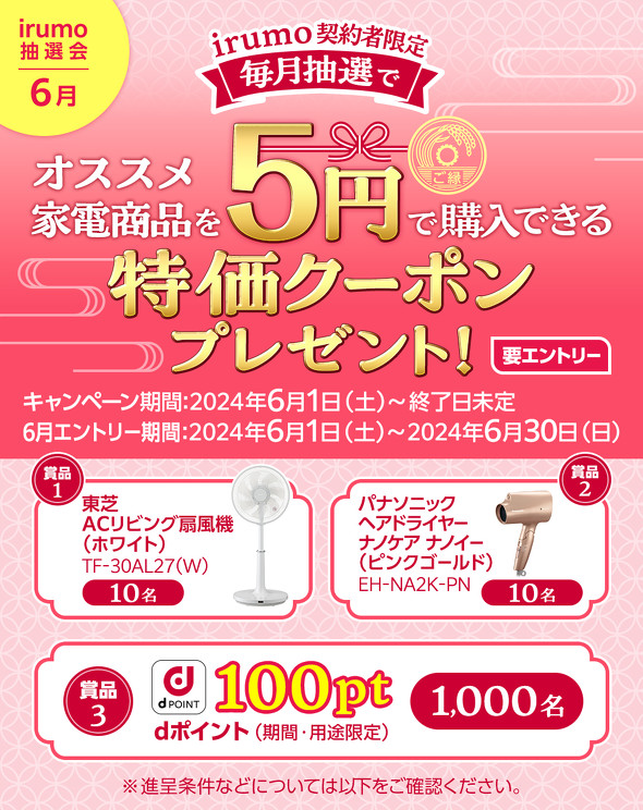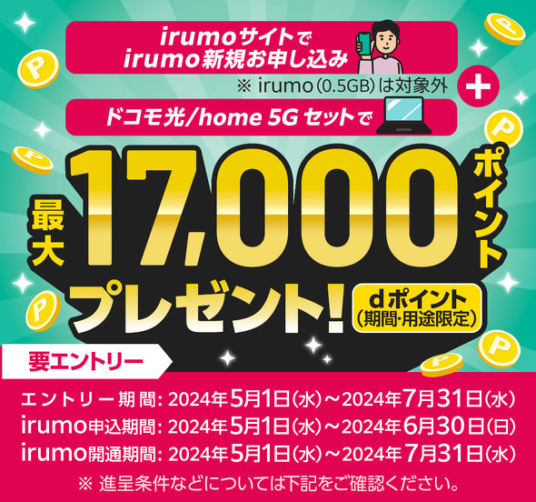 期間中にirumoのサイトから「irumo(0.5GB)」をMNPを利用して契約して利用を開始し、利用を開始した月の翌月時点で「dポイントクラブ」会員であるユーザーが対象。dポイント3300ポイントを付与する。