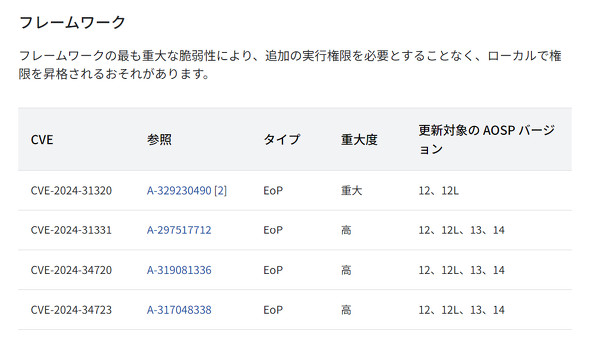 最も重大度の高い脆弱性は、フレームワークコンポーネントに関するもので、追加の実行権限なしにローカルで権限を昇格されるおそれがある。