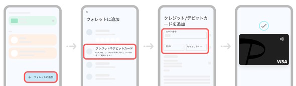 Androidスマホでタッチ決済を使う場合は、Google ウォレットアプリから設定を行う必要がある(画像はカードの新規登録を前提としているが、既にGoogle Payに支払い情報を登録している場合は、一覧から当該カードを選んで登録を進めることもできる)