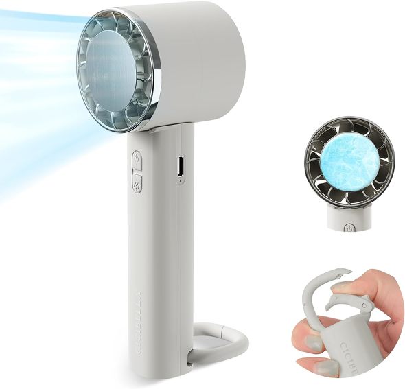 ハンディファンは、風が気持ちいい反面、気温が高いと熱風を吹き付けるだけになってしまいがち。その点、冷却プレートを搭載したハンディファンであれば、気温が高くても冷たい風を送ることが可能です。CICIBELLAのハンディファンは、前面に冷却プレートを備えており、そこを風が通過することで、冷たい風を感じられます。また、冷却プレートを直接首などに当てて使うといったことも可能です。冷却プレートが不要な場合にはオフにして稼働時間を延ばすことができます。