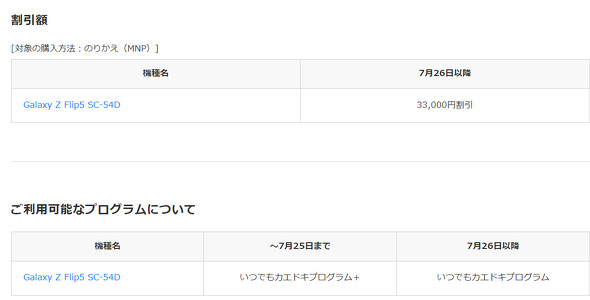 NTTドコモは、7月26日以降にドコモオンラインショップでの「Galaxy Z Flip5 SC-54D」の割引内容を変更する。金額は全て税込み。