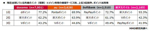 4キャリアの通信サービスをメイン利用していて共通ポイントを活用している1万5304人に、活用している共通ポイントを複数回答で聞いた。NTTドコモは「dポイント」、auは「Pontaポイント」、ソフトバンクは「PayPayポイント」、楽天モバイルは「楽天ポイント」がそれぞれ最多で、2位はNTTドコモ、au、ソフトバンクが楽天ポイント、楽天モバイルがVポイント、3位はNTTドコモ、au、ソフトバンクがVポイント、楽天モバイルがPayPayポイントとなった。