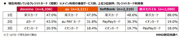 同様にクレジットカードを利用している1万3857人に、現在利用しているクレジットカードついて複数回答で聞いた。4キャリアユーザーともに「楽天カード」が最多で、2位はNTTドコモが「dカード」、auが「au PAY カード」、ソフトバンクが「PayPayカード」、楽天モバイルは「イオンカード」となり、3位はNTTドコモ、au、ソフトバンクがイオンカード、楽天モバイルがPayPayカードとなった。