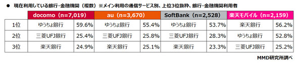 銀行/金融機関を利用している1万5376人へ、現在利用している銀行/金融機関について複数回答で聞いた。NTTドコモ、au、ソフトバンクは「ゆうちょ銀行」、楽天モバイルは「楽天銀行」がそれぞれ最多で、2位はNTTドコモ、au、ソフトバンクが「三菱UFJ銀行」、楽天モバイルがゆうちょ銀行、3位は、NTTドコモ、au、ソフトバンクが楽天銀行、楽天モバイルが三菱UFJ銀行となった。