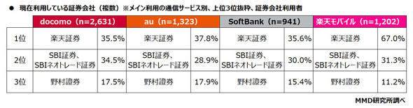 証券会社を利用している6097人へ、現在利用している証券会社について複数回答で聞いた。4キャリアユーザーともに「楽天証券」が最も多く、次いで「SBI証券、SBIネオトレード証券」「野村證券」となった。